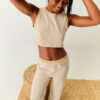 a modelagem é mais ajustadinha ao corpo, em estilo regatinha, com decote e cavas de ribana na mesma tonalidade.