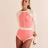 a modelagem dele tem pala na cintura, que super valoriza a silhueta.. as mangas são do tipo raglan (recorte em diagonal), oferecendo mais liberdade no movimento (não atrapalha a remada hehe). o detalhe da mãozinha (luvinha) traz uma proteção extra para a exposição solar. e o diferencial dele está no bolsinho nas costas com zíper, extremamente prático para quem quer levar parafina, chave do carro..