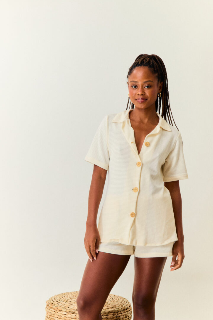 possui modelagem reta, gola tradicional (mas sem estrutura ~ trazendo mais suavidade a peça), mangas curtas e levemente soltas, e abertura frontal com botões amadeirados.